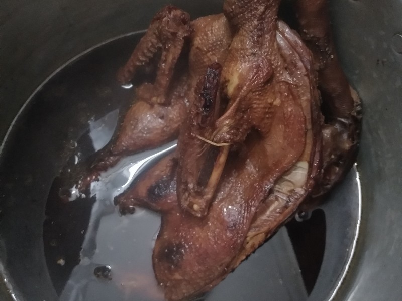 鸭子入烤箱 20 分钟左右的时候,开始准备卤水。把之前准备好的香料包放进去,再倒进生抽、老抽、冰糖、生姜。大火煮 20 分钟左右,卤水的味道基本就出来了。如果在入味的时候盐放少了,可在此处适当加盐。然后,将烤熟的鸭子放进卤水,小火煮 10 分钟,再翻一面煮 10 分钟。这个过程中,鸭子充分吸收卤水的味道,使各种香味相互融合。
